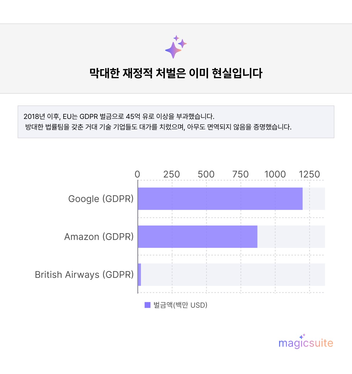 재정적 처벌: GDPR 벌금은 전 세계 연간 수익의 최대 4% 또는 2천만 유로 중 더 높은 금액에 달합니다
