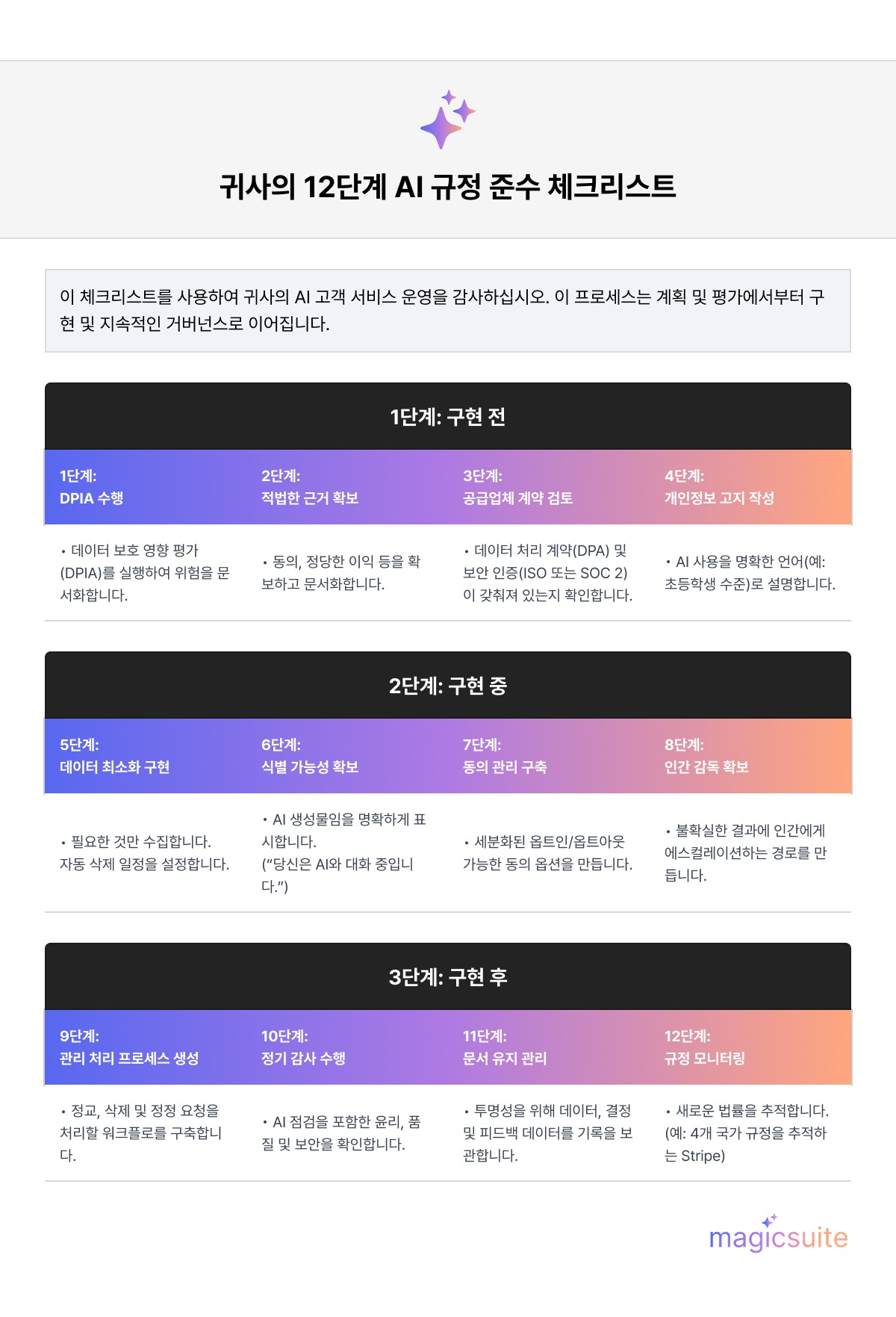 이 체크리스트를 사용하여 현재 AI 고객 서비스 운영을 감사하세요. 각 항목은 중요한 컴플라이언스 요구사항을 나타냅니다.