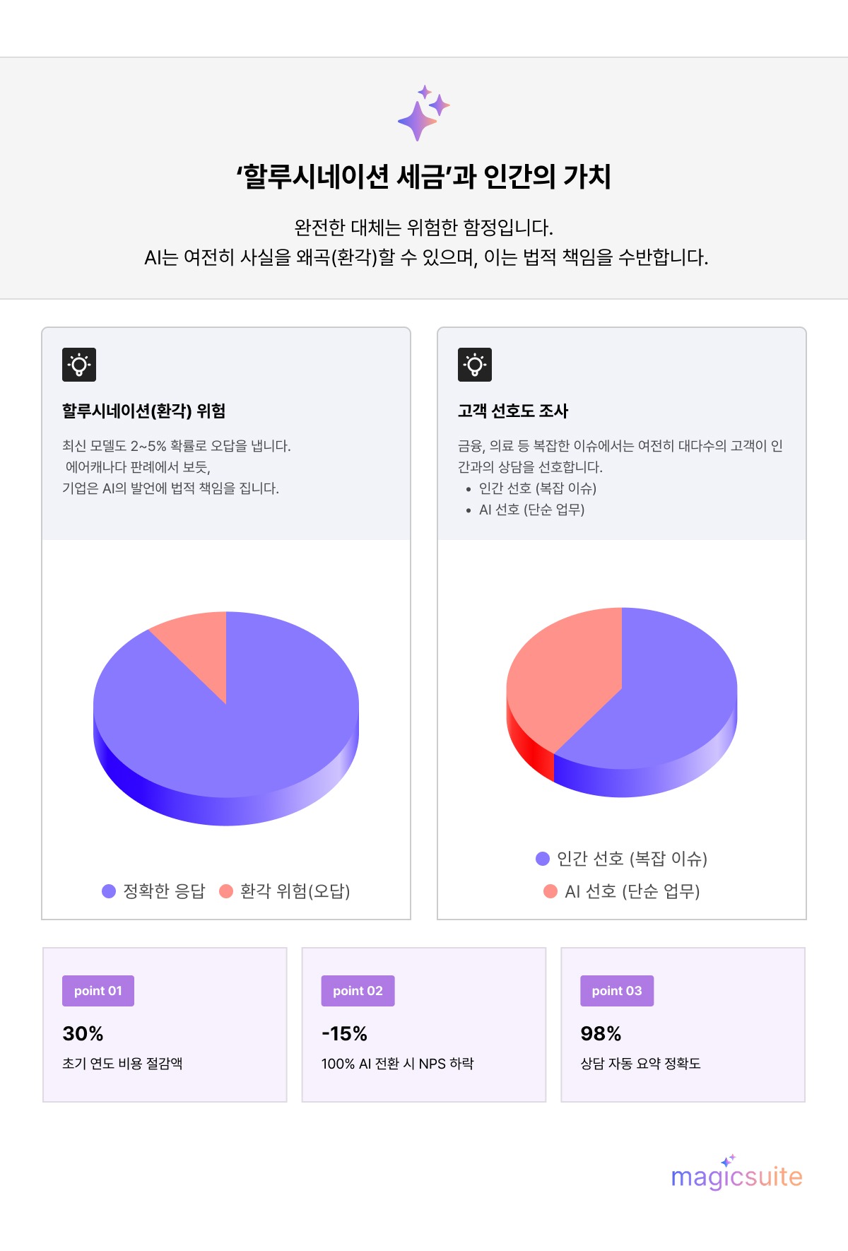 여기서 얻을 수 있는 교훈은 AI에는 오케스트레이터가 필요하다는 것입니다. 완전한 대체는 위험한 함정입니다. 2025년에도 기업급 모델은 여전히 2%~5%의 사례에서 "환각"(자신 있는 잘못된 정보)을 경험합니다.