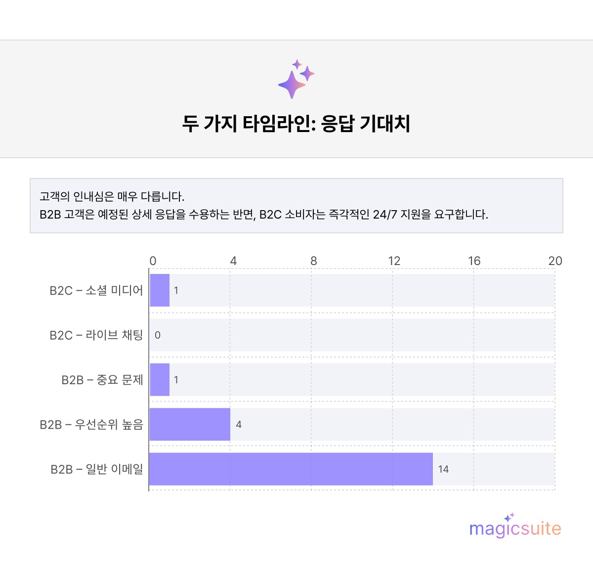 MagicSuite.ai는 AI 기반 고객 서비스 솔루션을 제공합니다. 우리는 기업이 규모에 맞게 탁월한 지원을 제공하도록 돕습니다. 우리 플랫폼은 B2B와 B2C 요구 사항 모두에 적응합니다. 복잡한 상황에 대한 원활한 인간 인계를 보장하면서 일상적인 문의를 자동화합니다. MagicSuite.ai가 귀하의 고객 서비스 전략을 어떻게 혁신할 수 있는지 자세히 알아보세요. B2B와 B2C 고객 서비스 간의 선호 커뮤니케이션 채널
