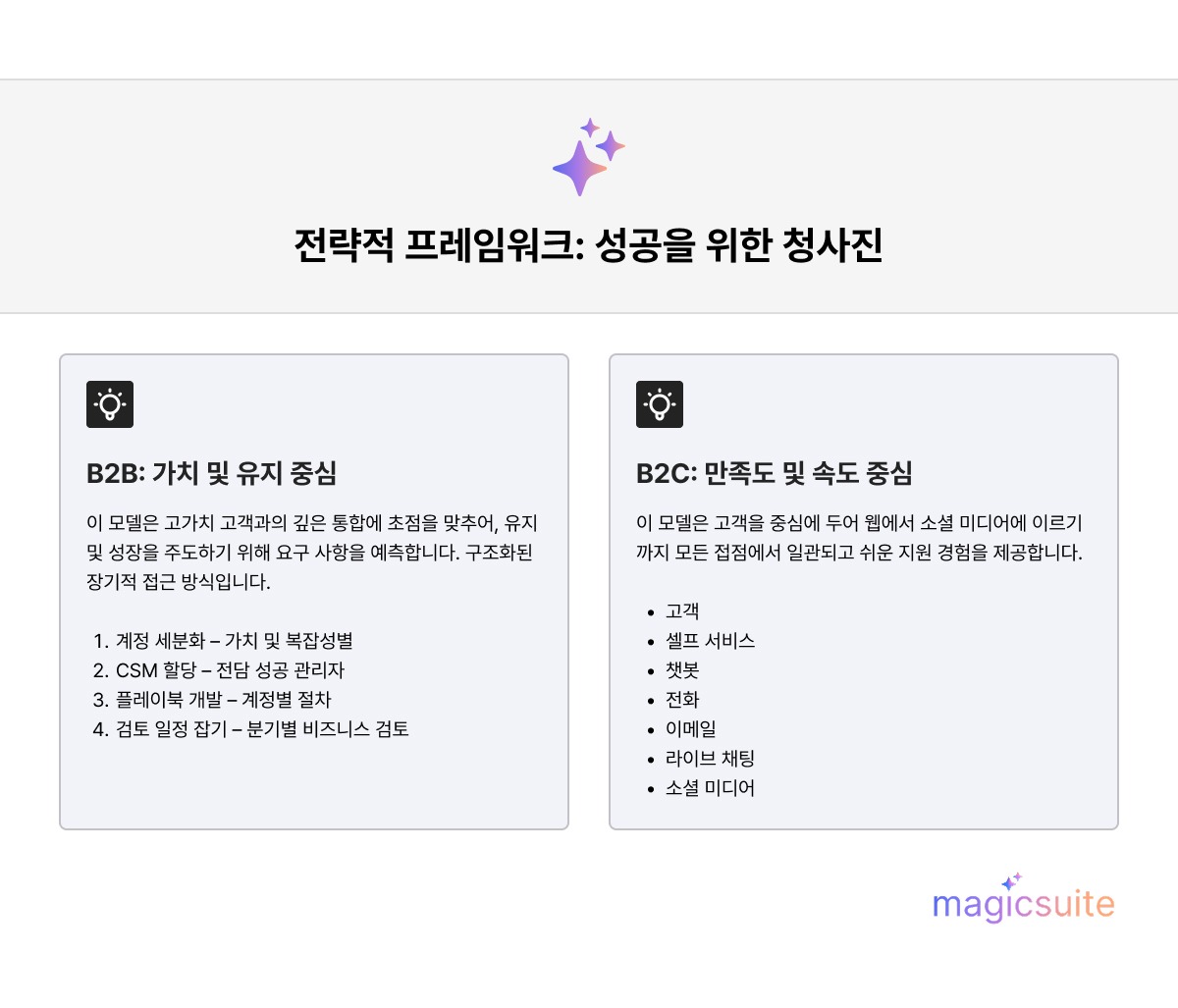 고가치 계정에 전담 팀이나 개인을 배정합니다. Gartner 연구에 따르면 전담 계정 관리가 있는 회사는 고객 유지율이 23% 더 높습니다.
