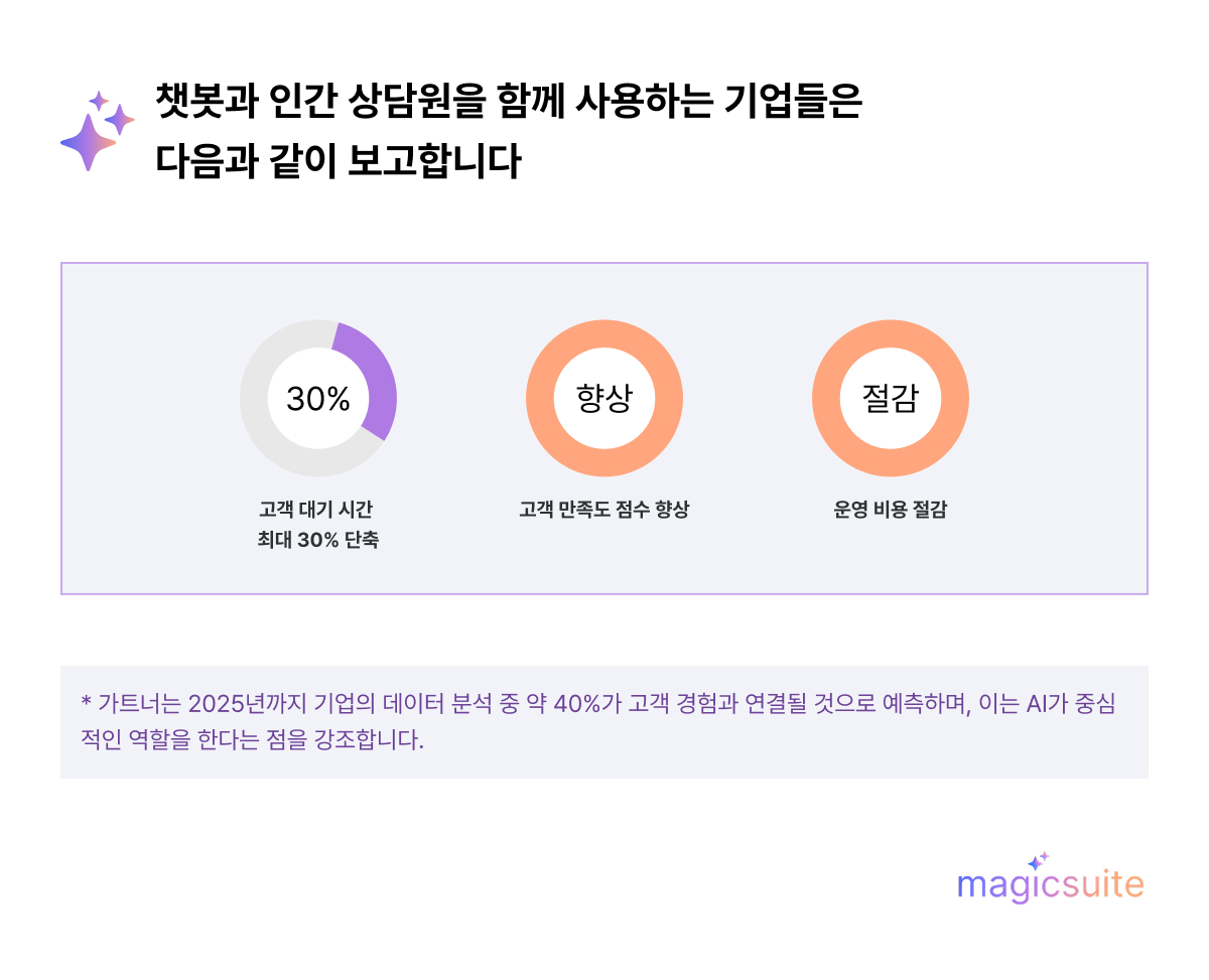 가장 효과적인 무료 AI 챗봇으로 고객 서비스를 자동화하고, 복잡한 문제는 사람 상담원에게 매끄럽게 전달하는 방법을 찾고 있다면, MagicSuite의 한국어 가이드를 참고하세요.