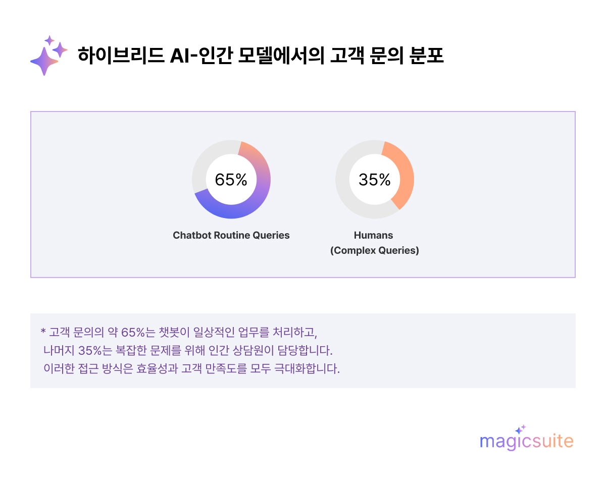 AI 챗봇은 단순하고 반복적인 요청에 빠르게 대응하지만, 모든 고객 문제를 완벽히 해결할 수는 없습니다. 복잡하거나 감정이 필요한 상황에서 적절한 인간 상담원으로 빠르게 연결하는 것이 중요합니다. 이 하이브리드 방식은 고객의 불만을 줄이고, 상담원의 업무 부담을 효과적으로 완화합니다.