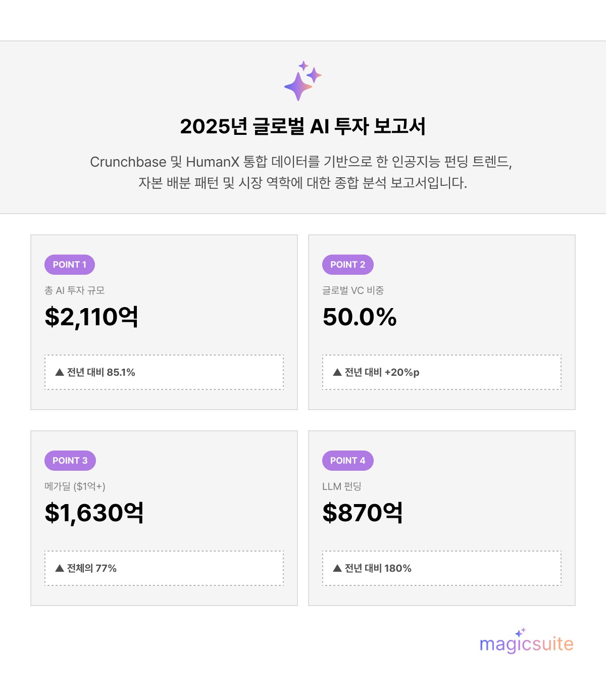 2,110억 달러라는 헤드라인 수치는 금융 지형의 결정적인 전환을 의미합니다. 이를 다른 관점에서 보면, AI 투자는 단 2년 만에 3배 이상 성장했습니다. 리포트는
