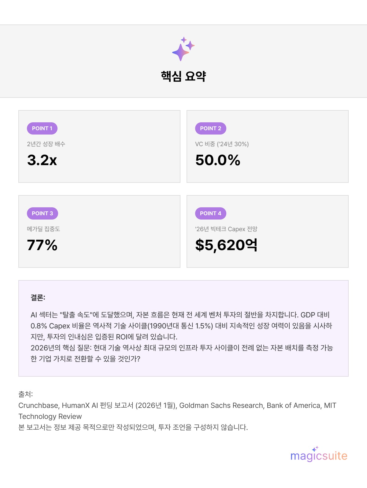 휴먼엑스 리포트는 단기적으로 낙관적인 전망을 유지하며, 2026년을 엑싯의 해로 예측합니다. 리포트는 27개 기업을 유력 IPO 후보로, 30개 기업을 빅테크의 내부 AI 역량 강화를 위한 유력 인수 대상으로 지목했습니다.