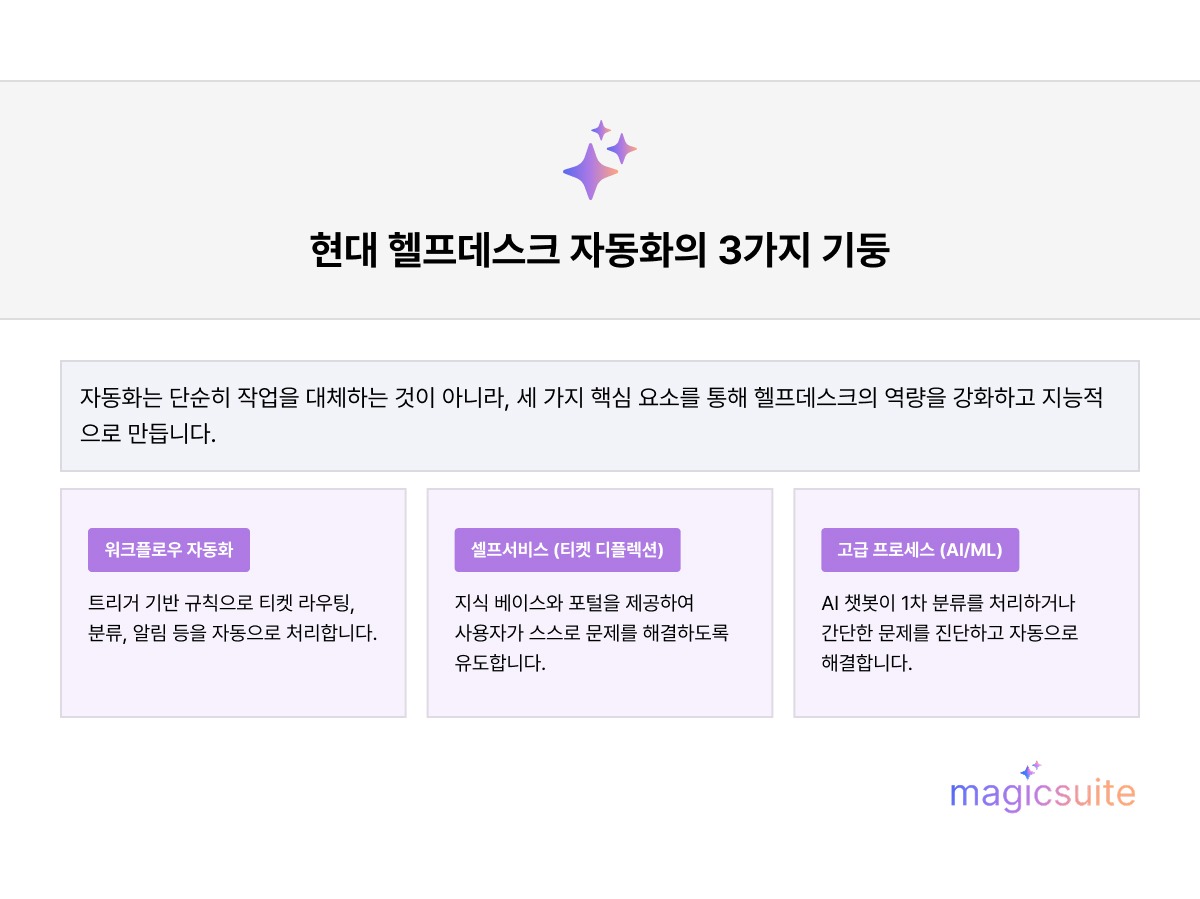 핵심적으로 헬프데스크 자동화는 워크플로우 규칙, 인공지능(AI), 머신러닝(ML), 지능형 라우팅과 같은 기술을 사용하여 인간 상담원이 전통적으로 처리했던 반복적이고 규칙 기반이며 낮은 가치의 작업을 수행하는 것을 포함합니다. 이것은 사람을 대체하는 것이 아닙니다. 그들의 능력을 강화하고 더 의미 있는 작업을 할 수 있도록 하는 것입니다.