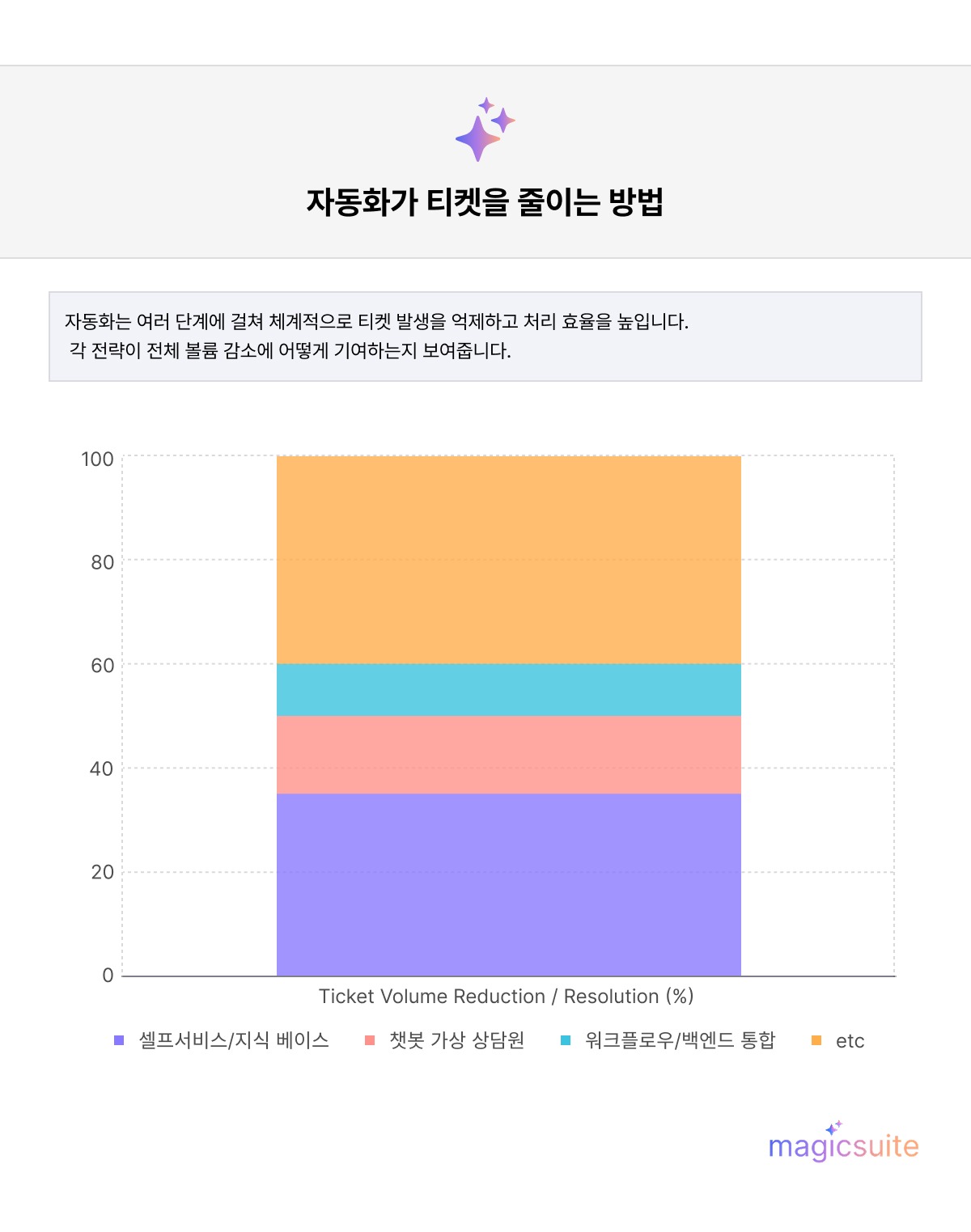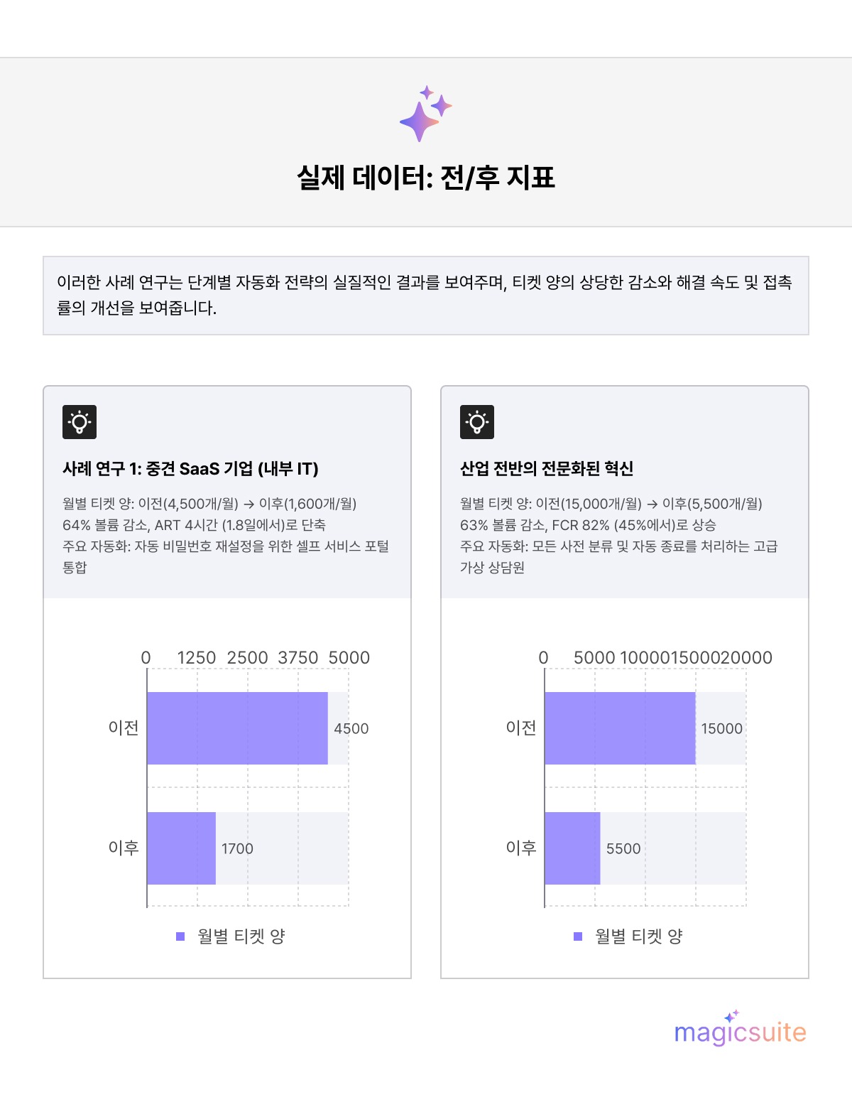 티켓 볼륨의 60% 감소는 하나의 만능 해결책에서 나오는 것이 아닙니다. 모든 각도에서 문제를 공격하는 전략적 자동화 전술의 조합에서 나옵니다.