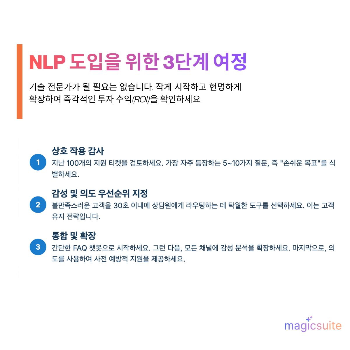 소규모 비즈니스에 있어 모든 고객 관계는 매우 중요합니다. 느리거나 비인간적인 응답 때문에 고객을 잃을 여유가 없습니다. NLP 솔루션을 선택할 때는 감성 분석(Sentiment Analysis) 과 의도 인식 수행 능력을 최우선으로 하세요. 이러한 기능은 당신의 브랜드 평판을 보호하고 고품질 고객 경험을 보장하는 핵심입니다. 분노한 고객을 30초 이내에 인간 상담원에게 라우팅할 수 있는 시스템은 단순한 도구가 아니라 고객 유지 전략입니다.