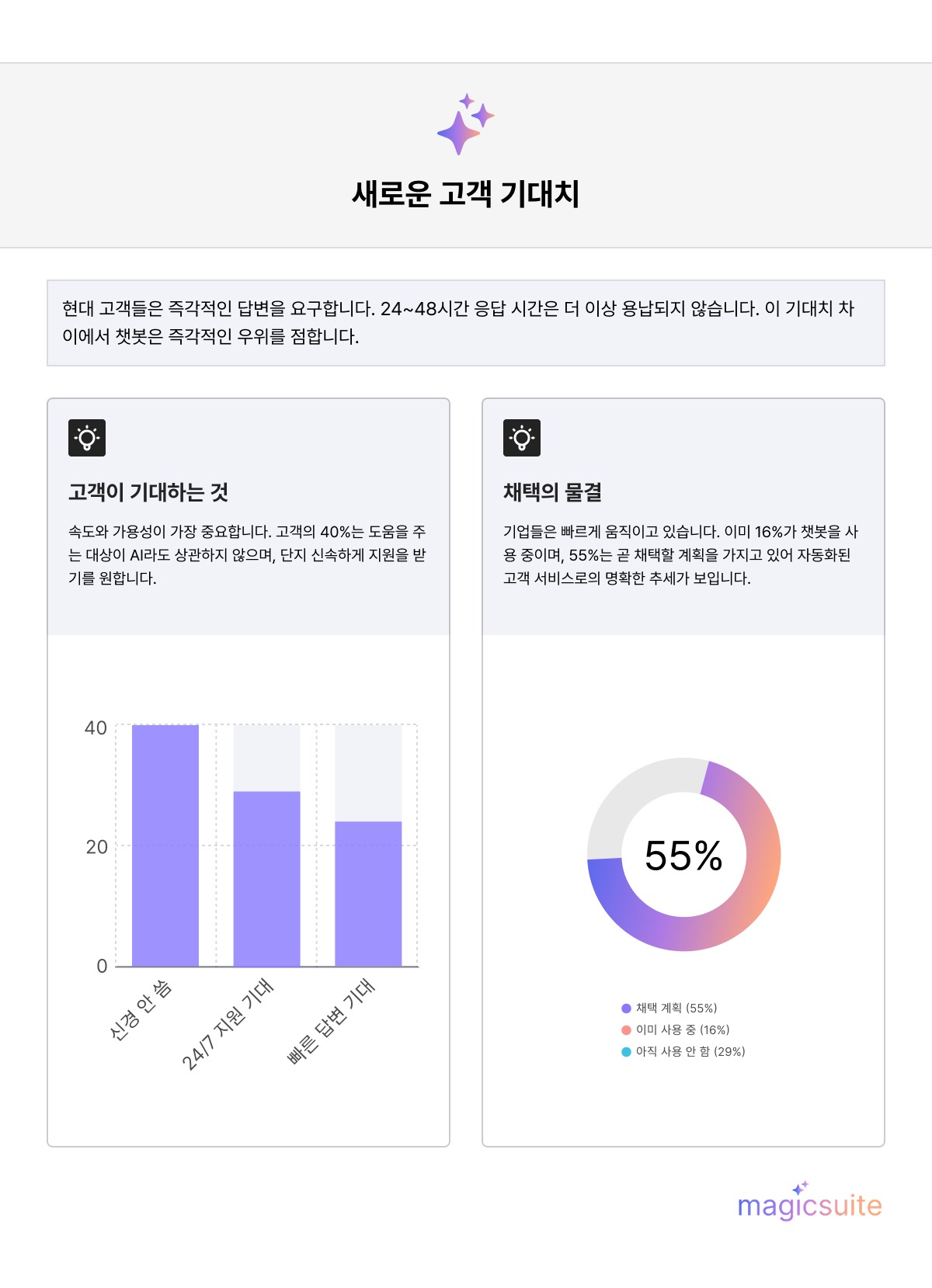 고객들은 더 이상 인내심이 없습니다. 연구에 따르면 29%의 고객이 챗봇으로부터 연중무휴 지원을 기대하며, 24%는 신속한 응답을 기대합니다. 자정이나 일요일 아침에 질문이 있을 때, 24-48시간이 아닌 즉시 답변을 원합니다. 40%의 고객은 필요한 지원을 받기만 하면 챗봇이든 사람이든 상관하지 않습니다. 그들은 단지 문제를 빠르게 해결하기를 원합니다.