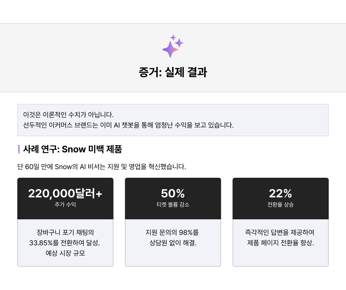 Snow Teeth Whitening은 Shopify 스토어에서 Rep AI 어시스턴트를 운영하여 에이전트 없이 지원 문의의 98%를 해결합니다. 첫 60일 동안 봇은 장바구니 이탈 채팅의 33.85%를 전환하여 220,000달러 이상의 추가 수익을 창출했으며, 제품 페이지 전환율을 22% 증가시켰고, 티켓 볼륨을 거의 50% 감소시켰습니다.