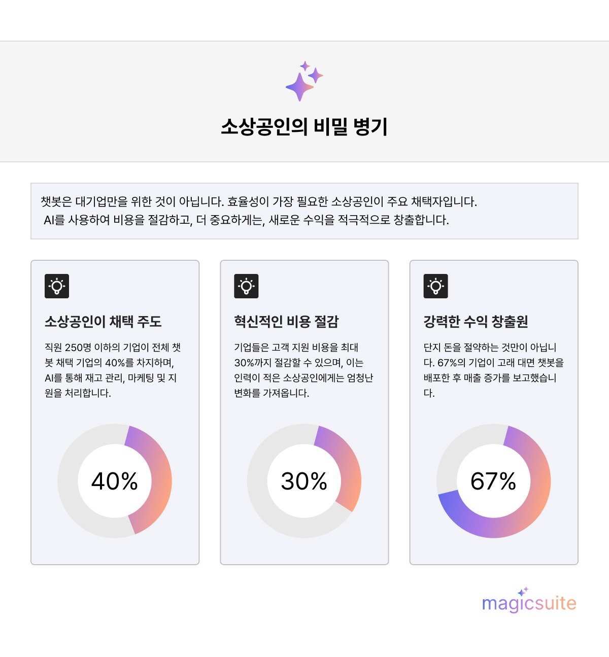 소규모 기업을 위한 챗봇이 고객 서비스를 어떻게 혁신하고, 매출을 67% 증가시키며, 전 세계적으로 80억 달러를 절감하는지 알아보세요. MagicTalk를 사용하여 전자상거래 지원을 자동화하세요.