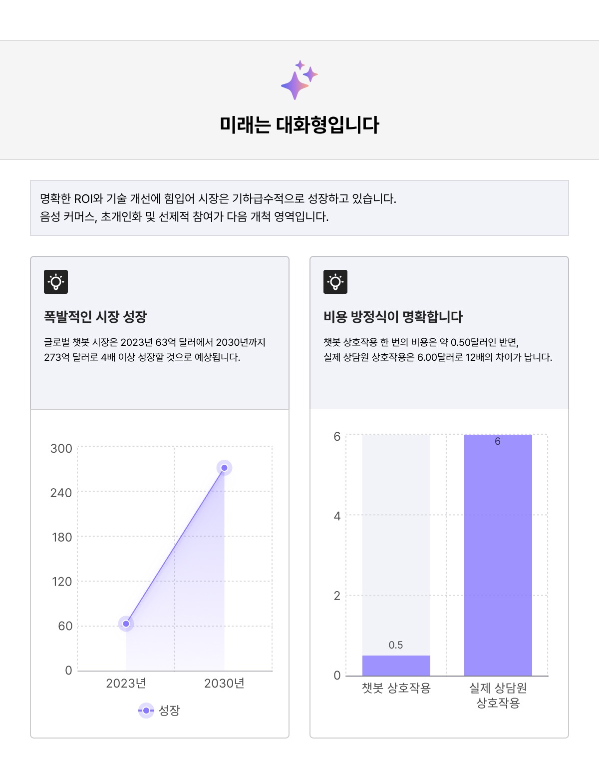 예. 챗봇 상호 작용 비용은 약 0.50달러인 반면, 인간 지원 상호 작용은 약 6.00달러입니다.