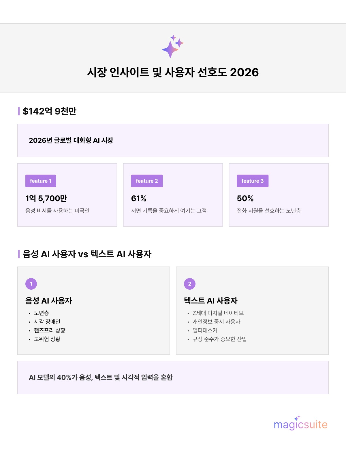 시장 현황: 2026년 글로벌 대화형 AI 시장이 142억 9천만 달러 규모에 도달하며 AI 도입은 기업의 필수 생존 전략이 되었습니다.