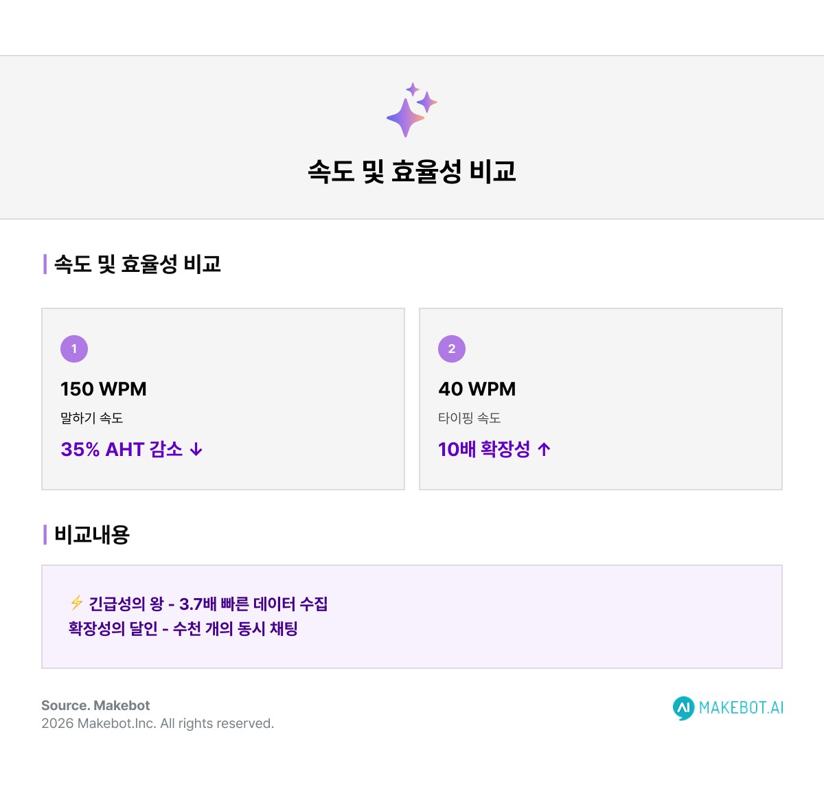 압도적인 속도: 일반적인 대화 속도는 분당 약 150단어인 반면, 타이핑은 40단어에 불과합니다. 보이스 AI는 문제를 훨씬 빠르게 해결하여 평균 상담 시간(AHT)을 최대 35%까지 단축합니다.