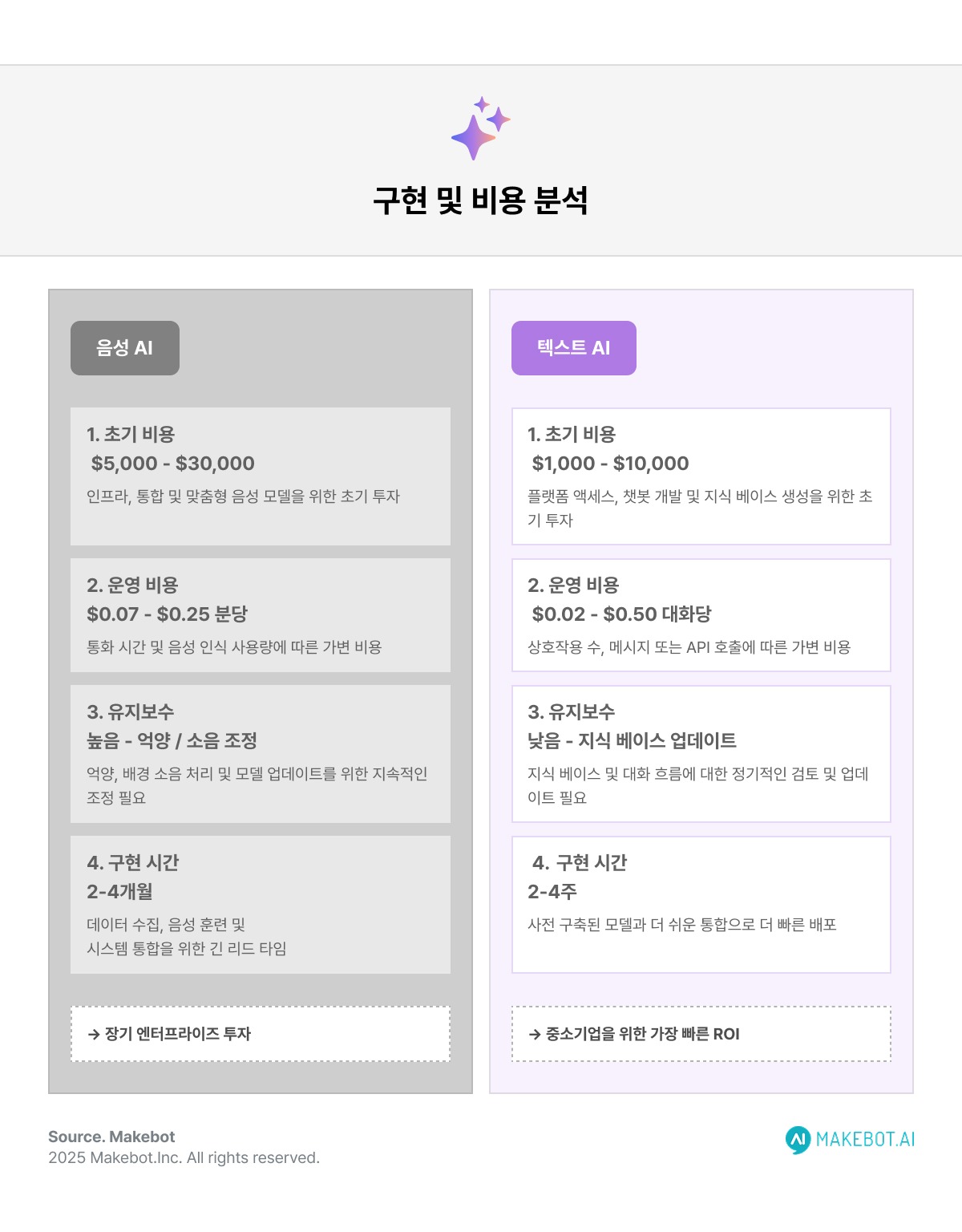 예산 수준: 초기 비용을 최소화하고 싶다면 Text AI로 시작하여 점진적으로 Voice AI 기능을 통합하는 로드맵이 권장됩니다.