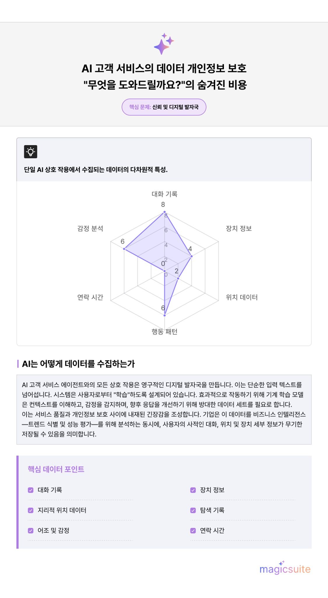 AI 고객 서비스 시스템과의 모든 상호작용은 디지털 발자국(Digital Footprint) 을 남깁니다. 사용자가 챗봇에 메시지를 입력하거나 가상 비서와 대화할 때, 시스템은 단순히 텍스트만 캡처하는 것이 아닙니다.