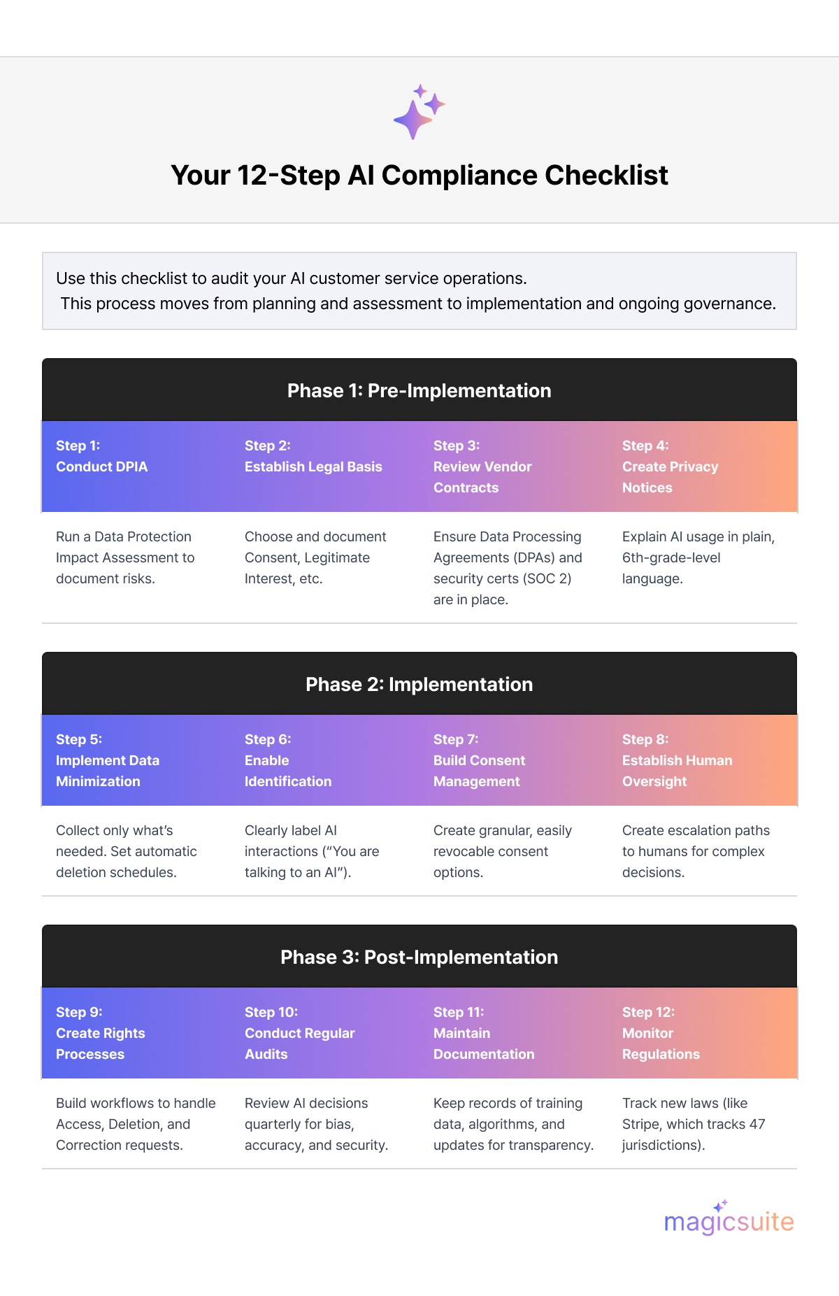 Use this checklist to audit your current AI customer service operations. Each item represents a critical compliance requirement.