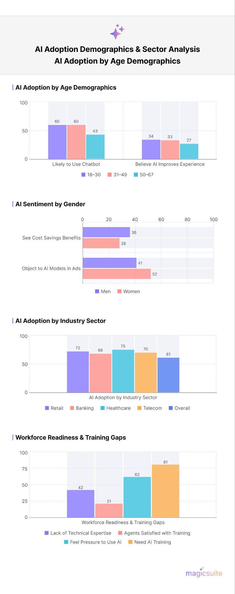 While one might expect younger generations to be the sole champions of AI, the data shows a broader acceptance. 60% of consumers in both the 18-30 and 31-49 age brackets are likely to use an AI chatbot. While this number dips slightly to 43% for the 50-67 age group, it’s clear that a majority across key consumer demographics are comfortable with AI-driven interactions. The appetite for AI is universal.