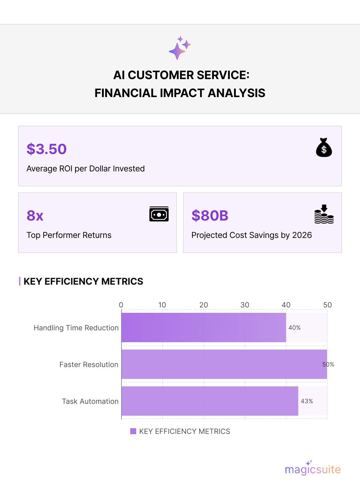 These returns are driven by staggering efficiency gains. Gartner projects that conversational AI will reduce contact center labor costs by $80 billion by 2026 [6]. This is achieved by automating routine tasks, allowing businesses to scale their support operations without increasing headcount.