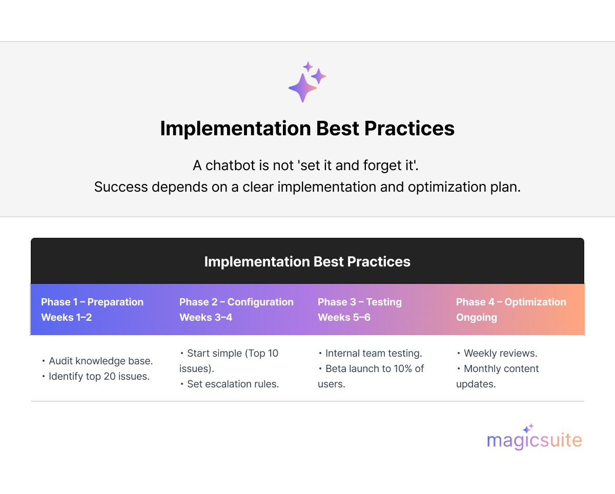 No technical team: Choose no-code platforms (MagicTalk, Ada, Tidio, HubSpot). Setup should take days, not months.