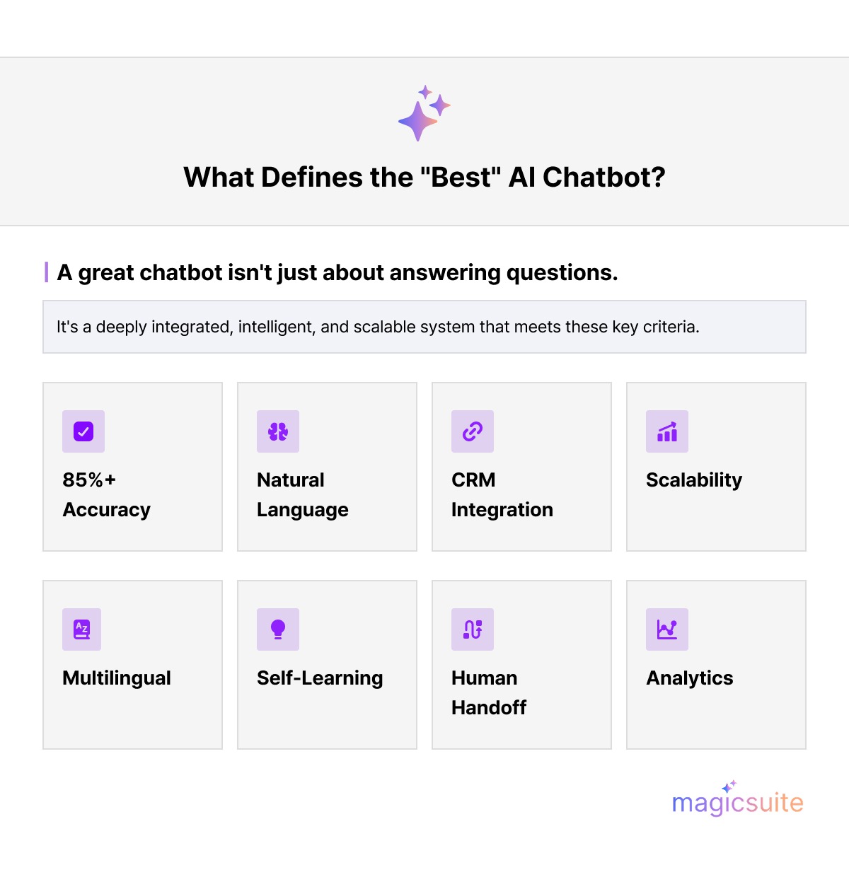 Not all chatbots are created equal. The best AI chatbot for customer support must meet specific criteria: