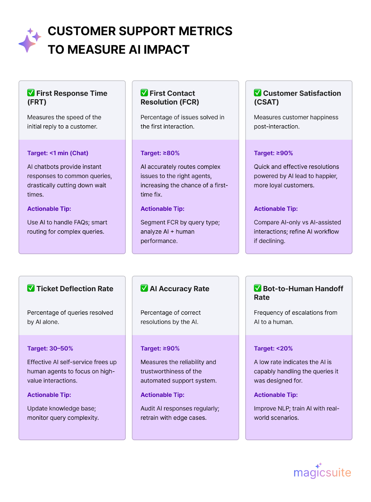 CSAT measures customer happiness with your service, typically through surveys after an interaction. While AI aims for efficiency, it should never come at the expense of customer satisfaction.
