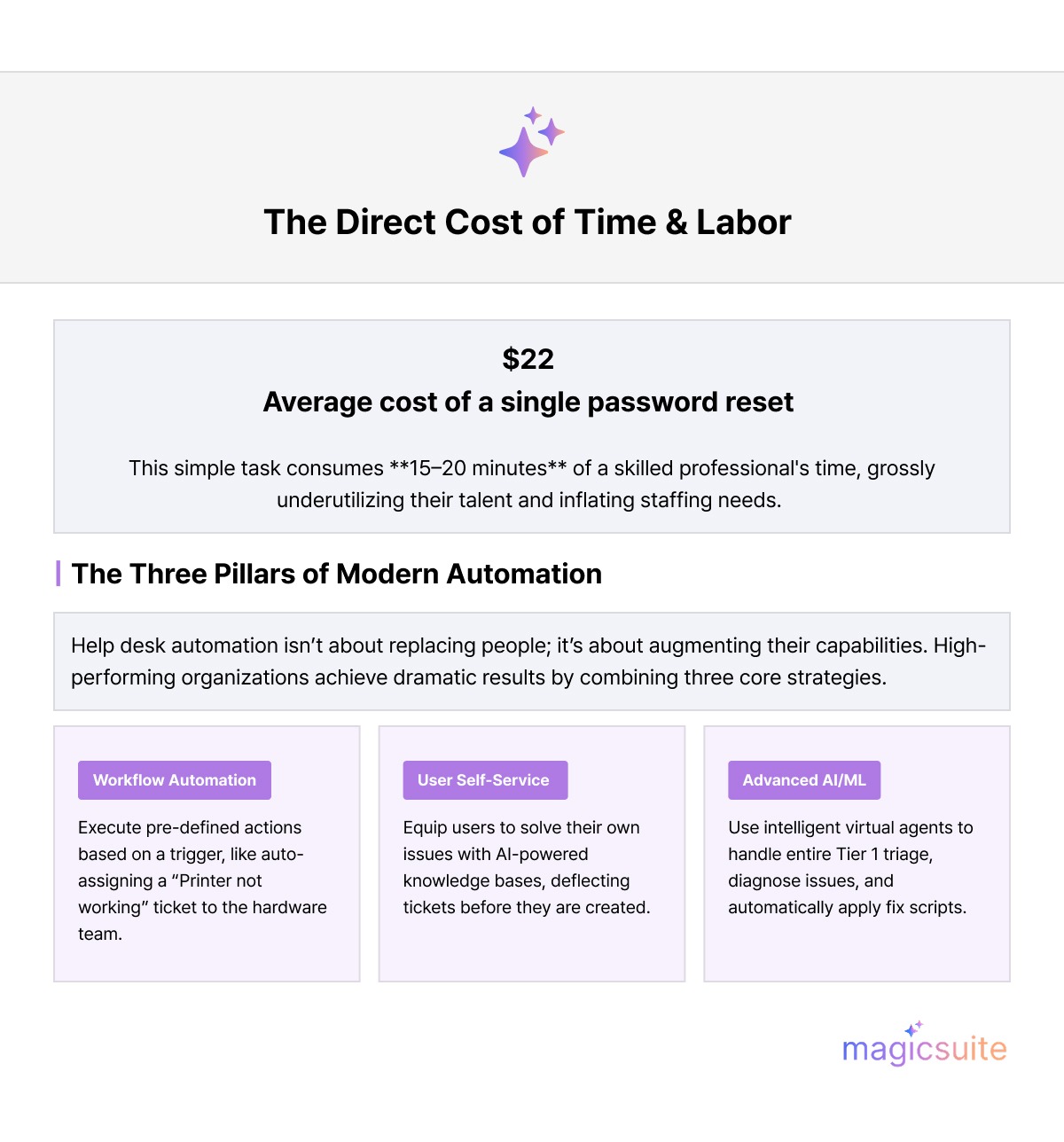Imagine a simple password reset. When a user calls or emails, a ticket is manually created. A technician qualifies the user, performs the reset, and closes the ticket, taking an average of $22 and 15–20 minutes of a skilled professional’s time. Multiply this by hundreds or thousands of low-level tickets per month.
