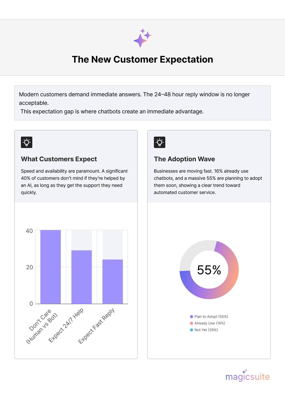 Your customers aren't patient anymore. According to research, 29% of customers expect 24/7 assistance from chatbots, and 24% expect a prompt response. When they have questions at midnight or on Sunday morning, they want answers immediately—not in 24-48 hours.
