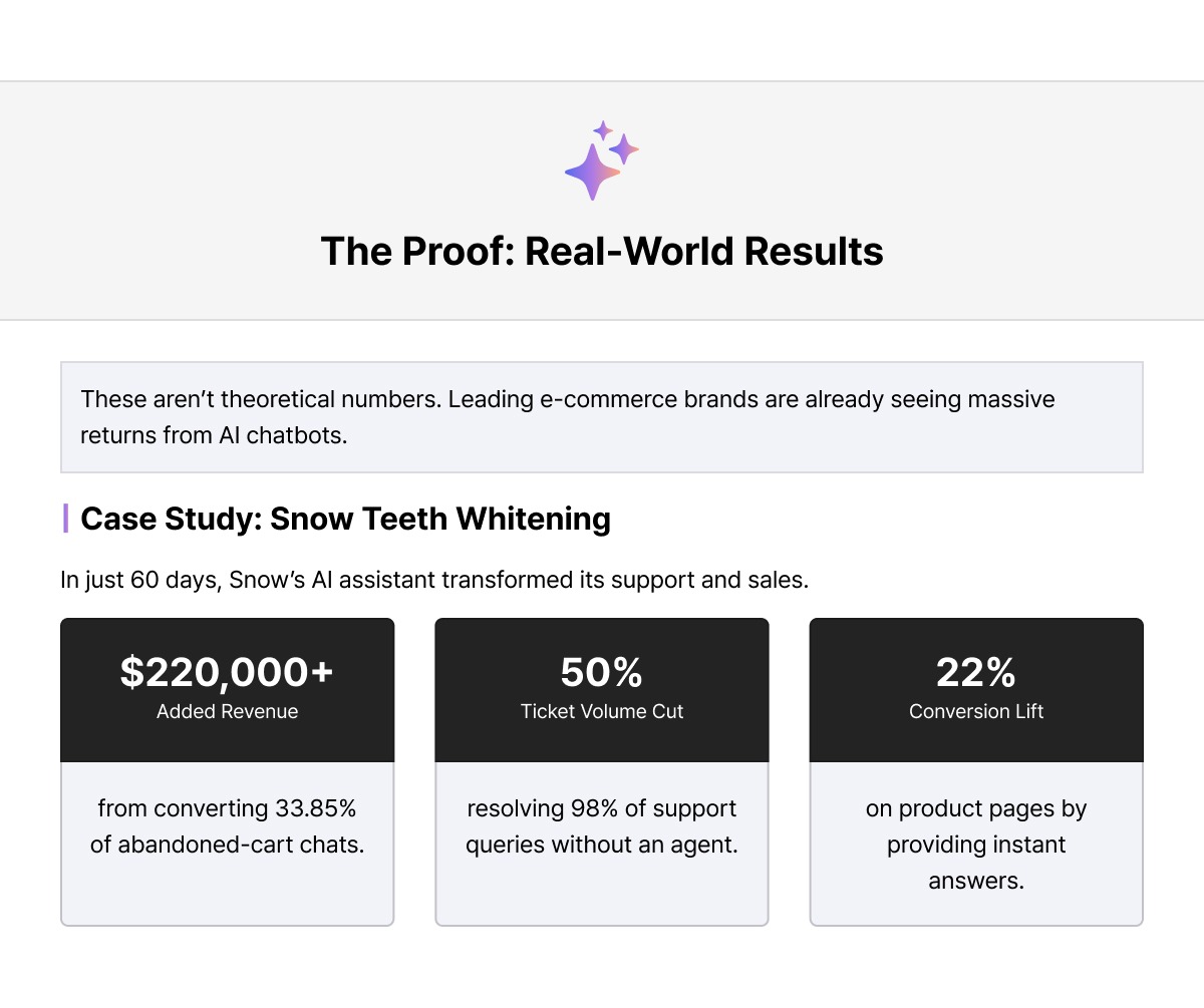 Snow Teeth Whitening runs a Rep AI assistant in its Shopify store that resolves 98% of support queries without an agent. During its first 60 days, the bot converted 33.85% of abandoned-cart chats, generating over $220,000 in additional revenue, lifted product-page conversion by 22%, and reduced ticket volume by almost 50%.