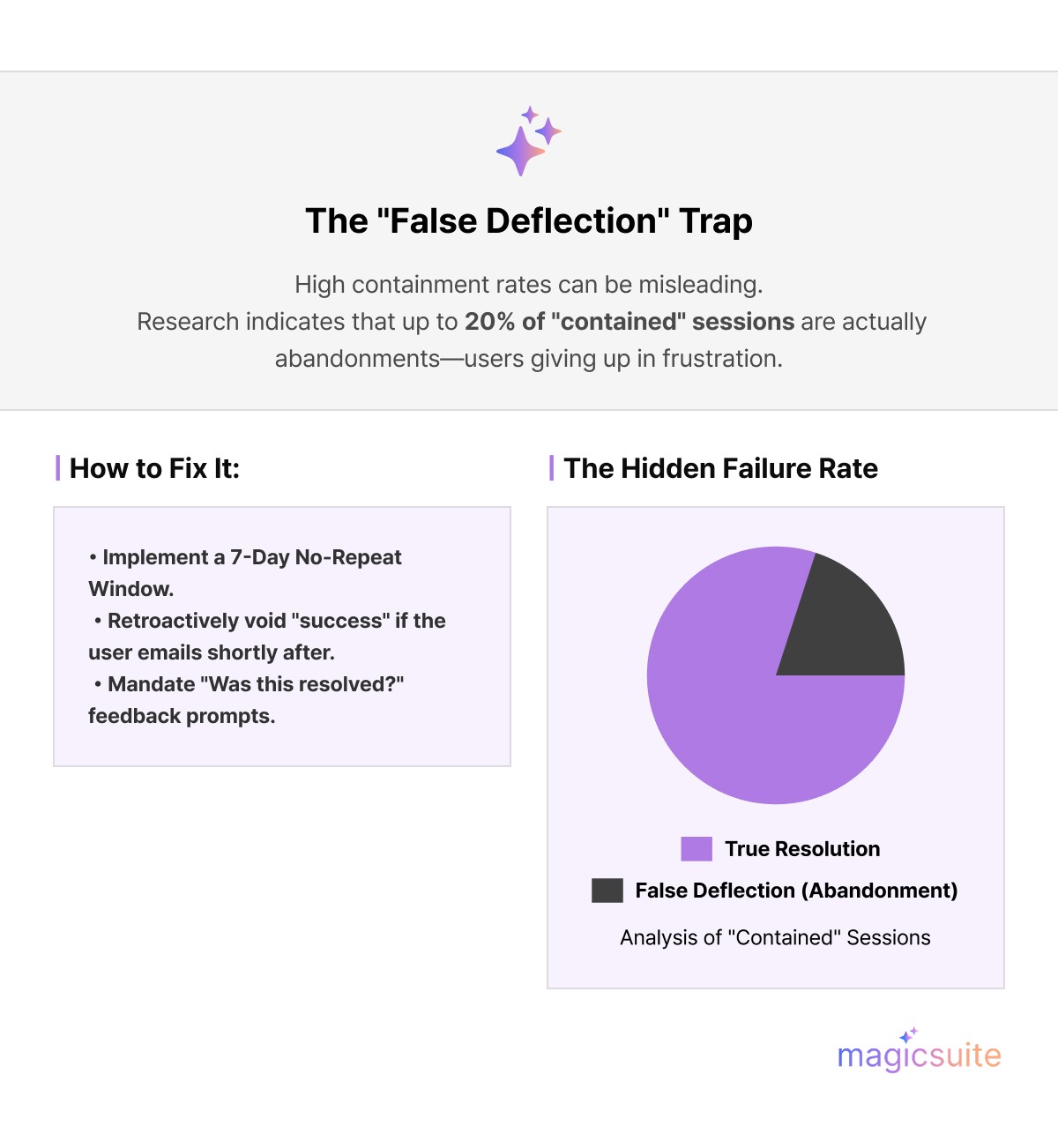 To combat false metrics, technical frameworks now mandate a 7-to-14-day "No-Repeat" window. If a customer reaches out for the same intent within this window, the initial AI session is retroactively marked as a "False Positive."