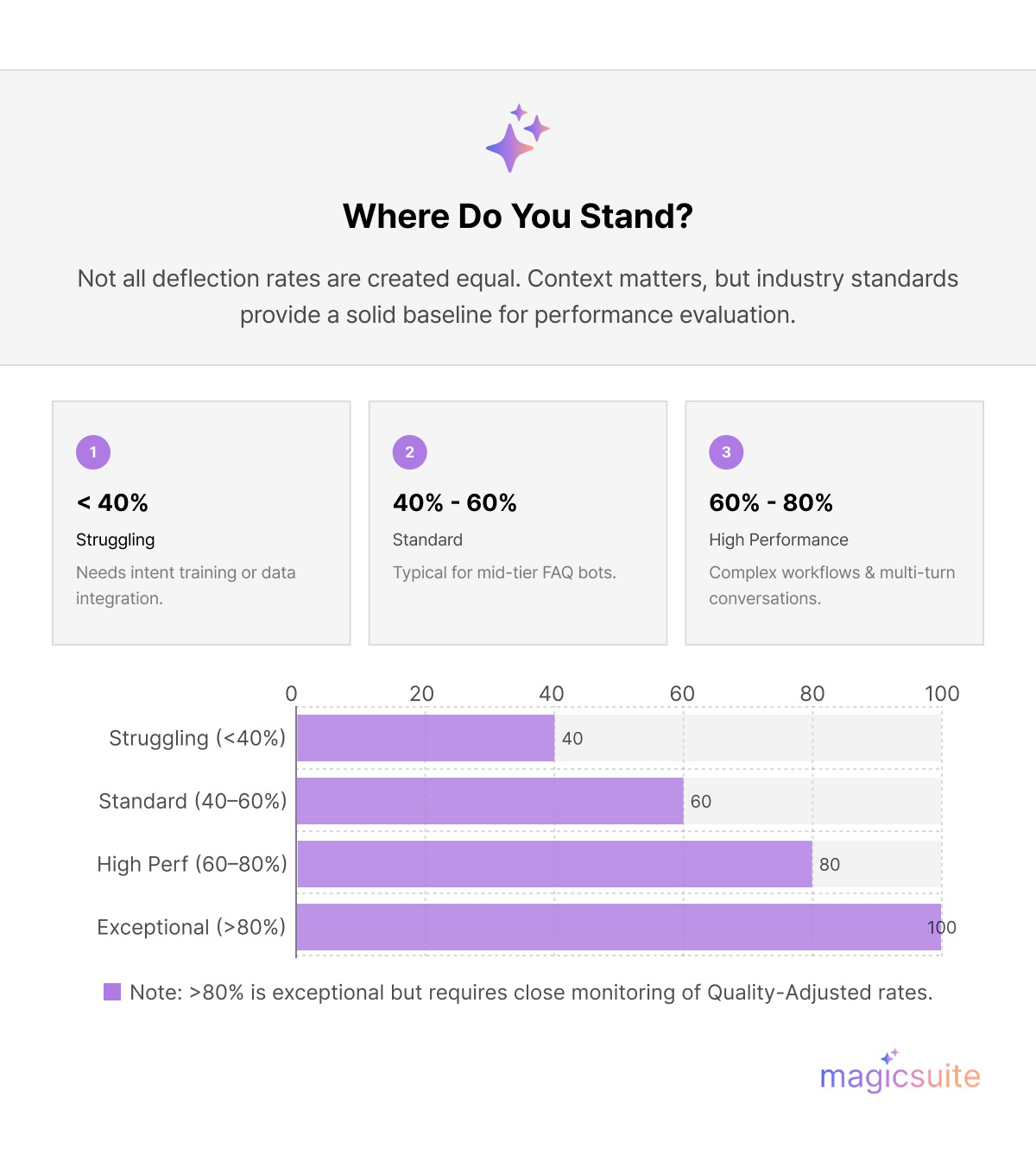Always adjust for quality by factoring in CSAT scores above 4/5 or low repeat contacts within 7 days—unadjusted high rates often hide false positives. For context, top-quartile performers in SaaS average 80-90% in 2026, correlating with 20-30% cost savings per query.