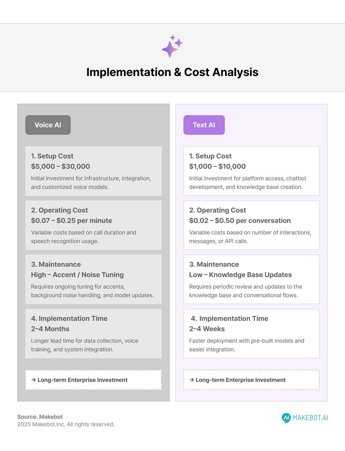 Text AI offers the fastest ROI for smaller budgets; Voice AI is a long-term investment for enterprise-grade contact centers.