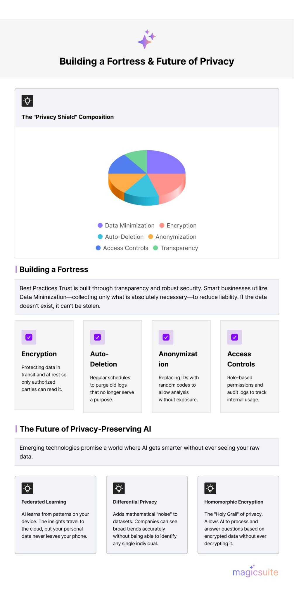 Emerging technologies promise better privacy protection without sacrificing service quality. Federated learning allows AI models to improve by learning from data patterns across many devices without that data ever leaving customer devices. The AI gets smarter while personal information stays private.